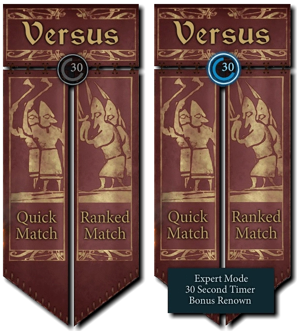 Expert Mode is an option for Quick and Ranked matches available in the Great Hall. In Expert Mode, the turn-timer is set to 30 seconds, rather than the 45 seconds of the default timer. Activating Expert Mode gives you a +2 Renown bonus per match, win or lose. Players who choose Expert Mode can still be matched against other players who are using the default timer mode. The Expert Mode is activated by default for Tournament matches.